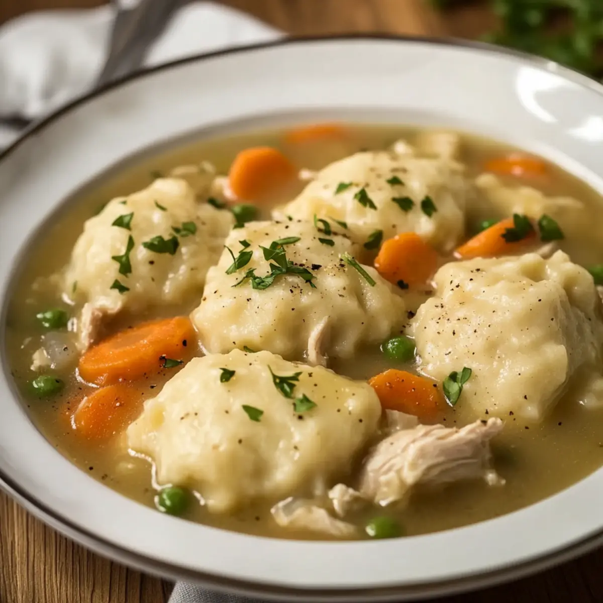 - Ladle portions into bowls. Garnish with parsley and serve warm to enjoy the comforting blend of chicken and dumplings.