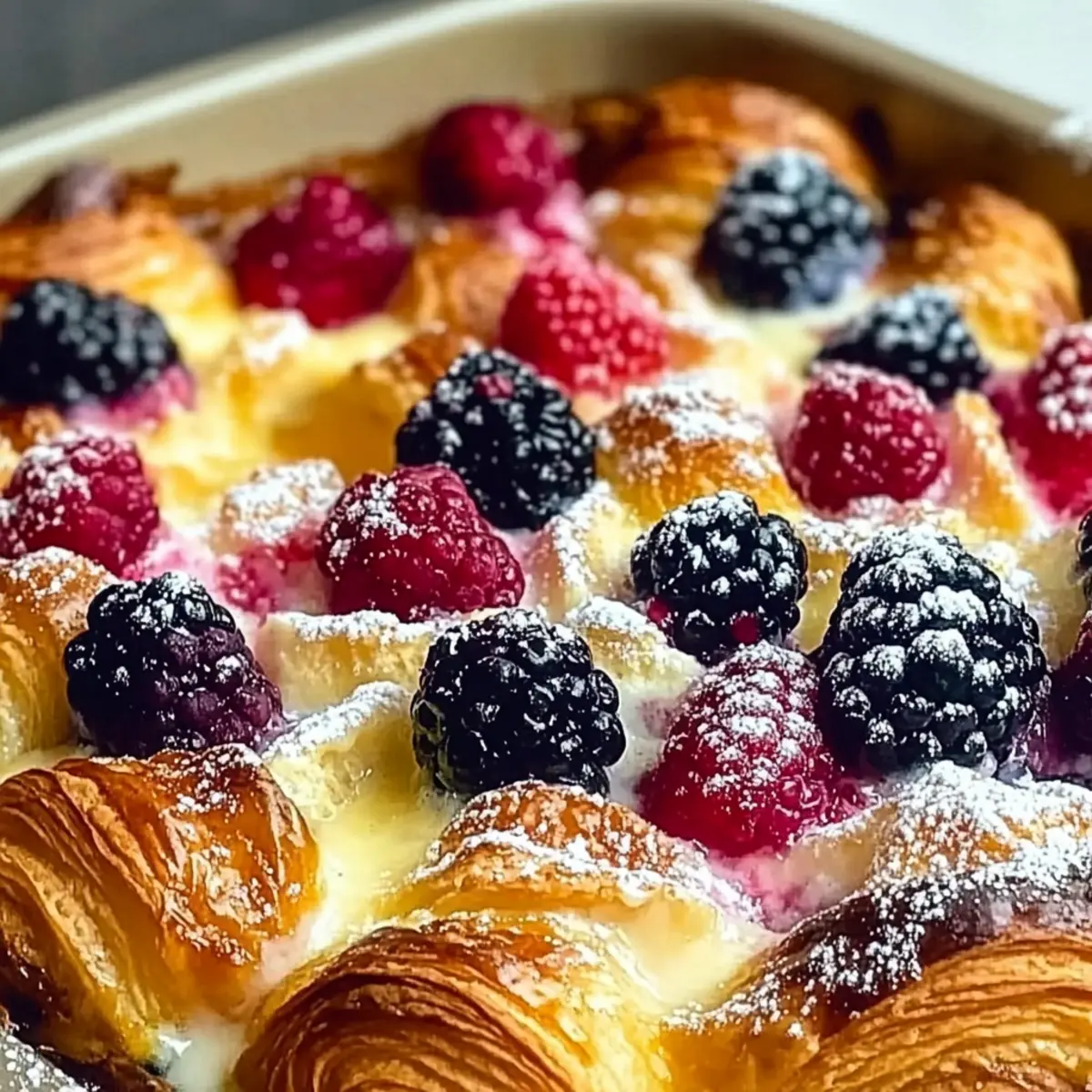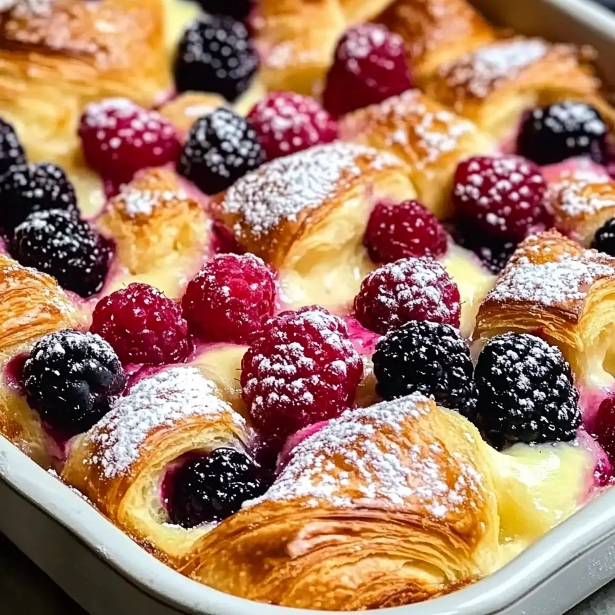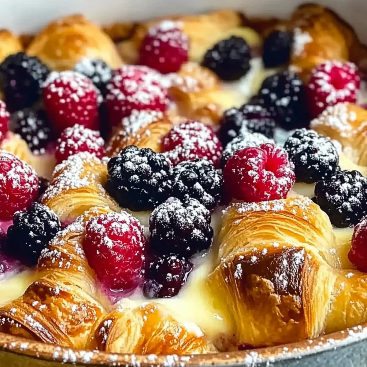 - Sprinkle the mixed berries evenly over the layered croissants.