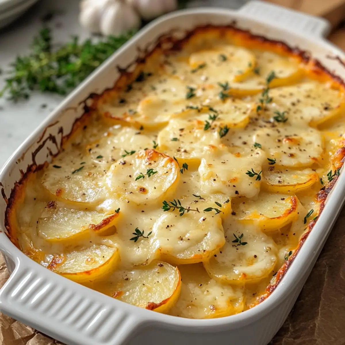 Creamy Comfort: Imagine layers of tender potatoes enveloped in a rich, garlicky cheese sauce—pure bliss on your plate.