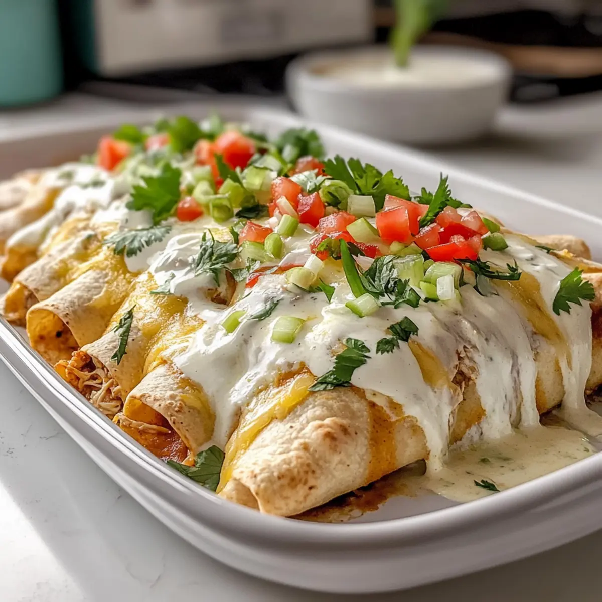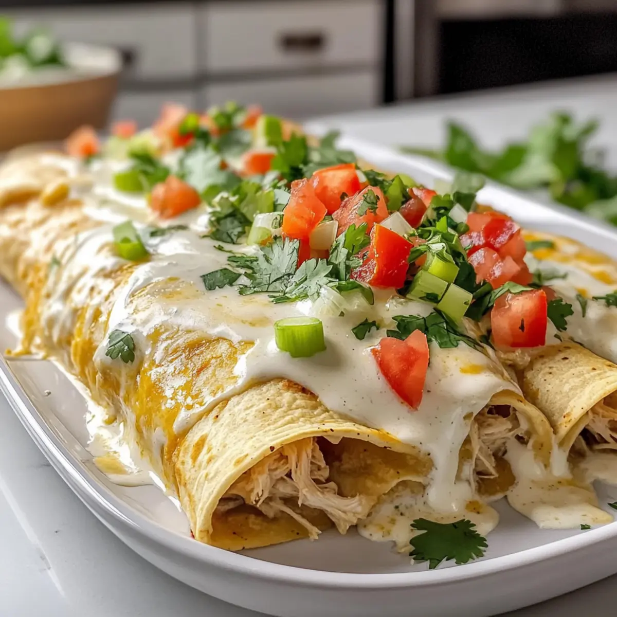 Once baked, carefully remove your Chicken Enchiladas with Sour Cream White Sauce from the oven. Let them sit for about 5 minutes, then garnish with fresh cilantro, diced tomatoes, and sliced green onions. This final touch adds flavor and visual appeal, making your dish as inviting as it is delicious.