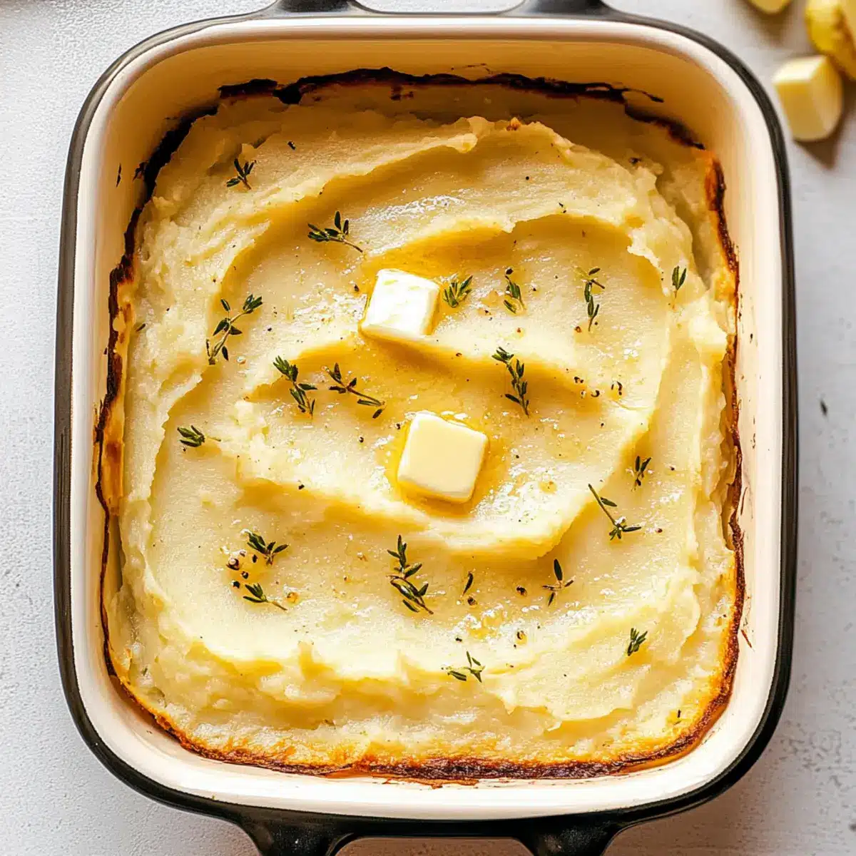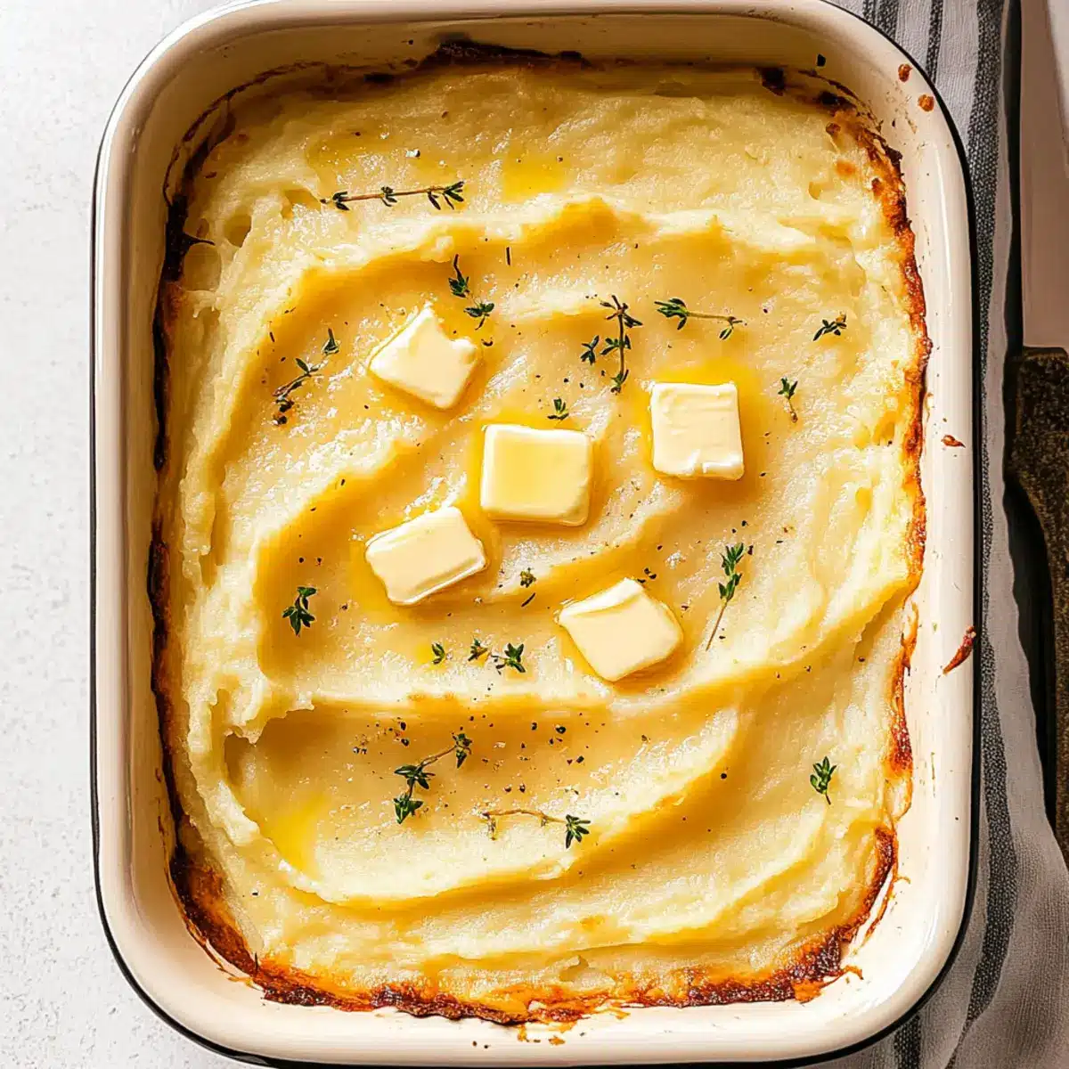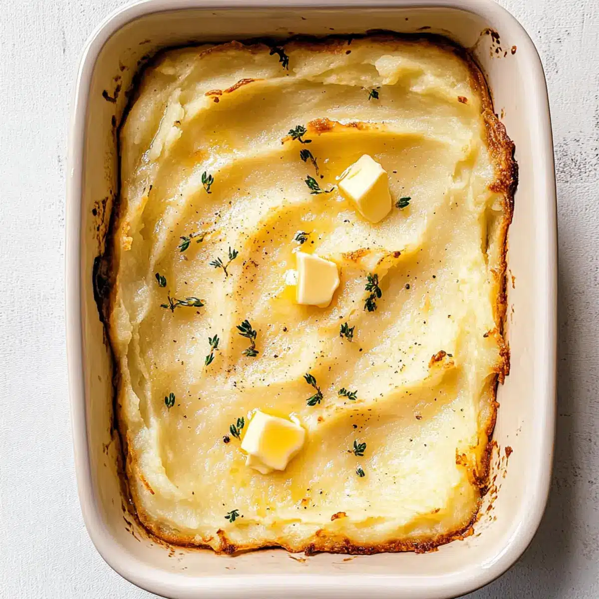 Once your mixture is smooth and creamy, transfer the potatoes to a greased 9×13 baking dish. Spread them out evenly to ensure even baking. To enhance flavor and texture, sprinkle cold butter cubes atop the mixture—this will create that irresistibly crispy golden crust you’re aiming for.