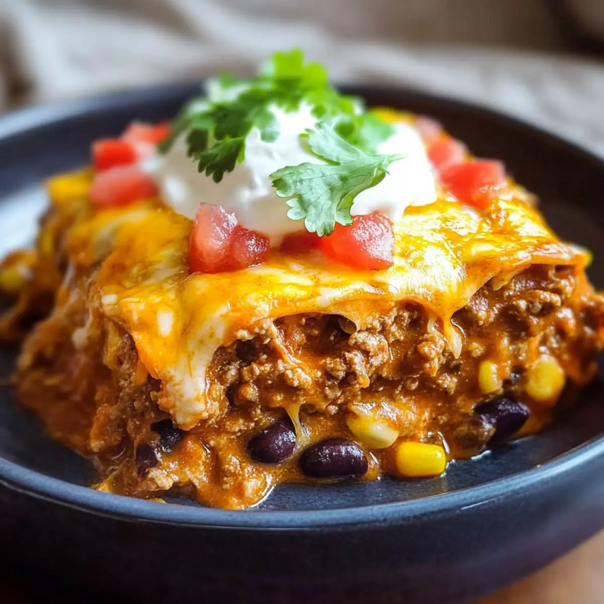 Once cooked, carefully ladle the lasagna-like Crockpot Beef Enchilada Casserole onto serving plates. Top each serving with diced tomatoes, extra dollops of sour cream, and a sprinkle of fresh cilantro for added flavor and color. Enjoy the warmth and coziness of this delightful dish that brings everyone to the table!