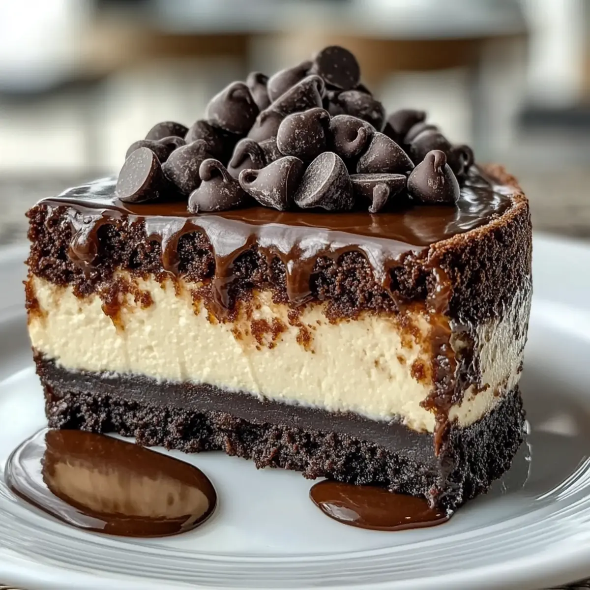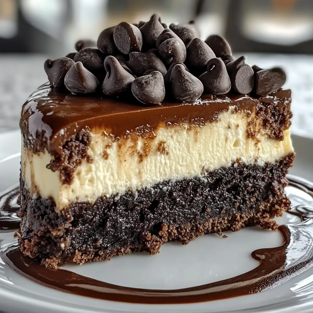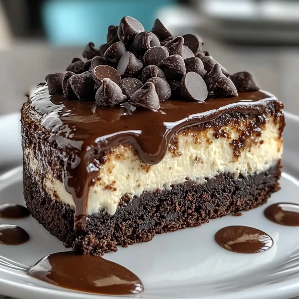 Pour the rich ganache over the chilled cheesecake, allowing it to flow over the edges for a decadent look. Sprinkle with chocolate chips if desired. Slice your Fudgy Brownie Bottom Cheesecake and serve chilled, savoring each layer of deliciousness combined in perfect harmony.