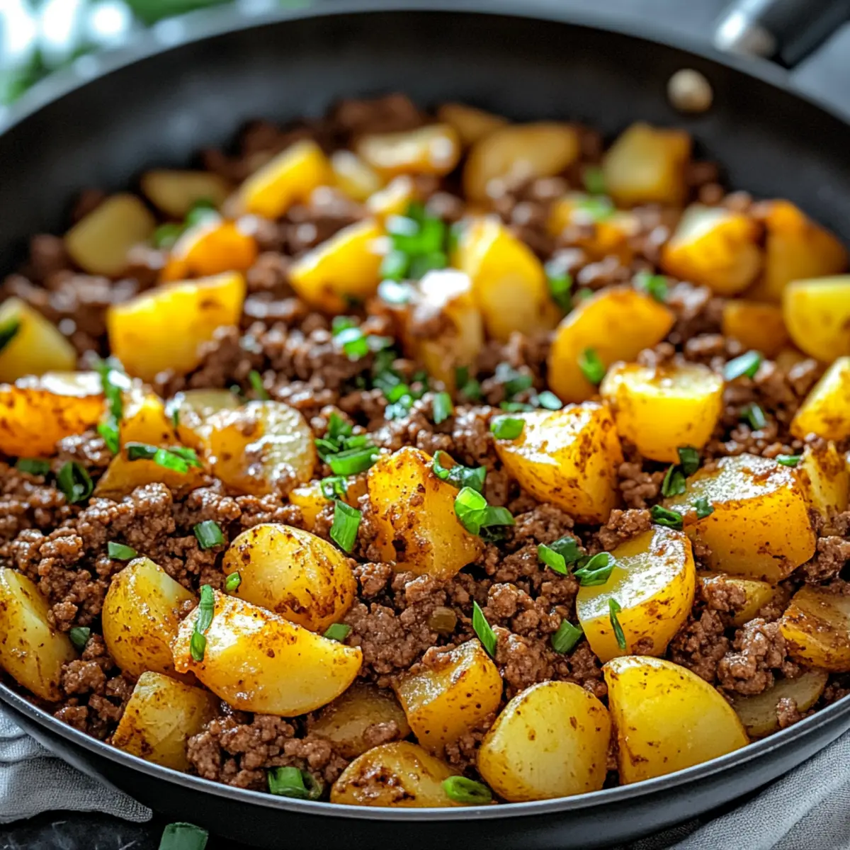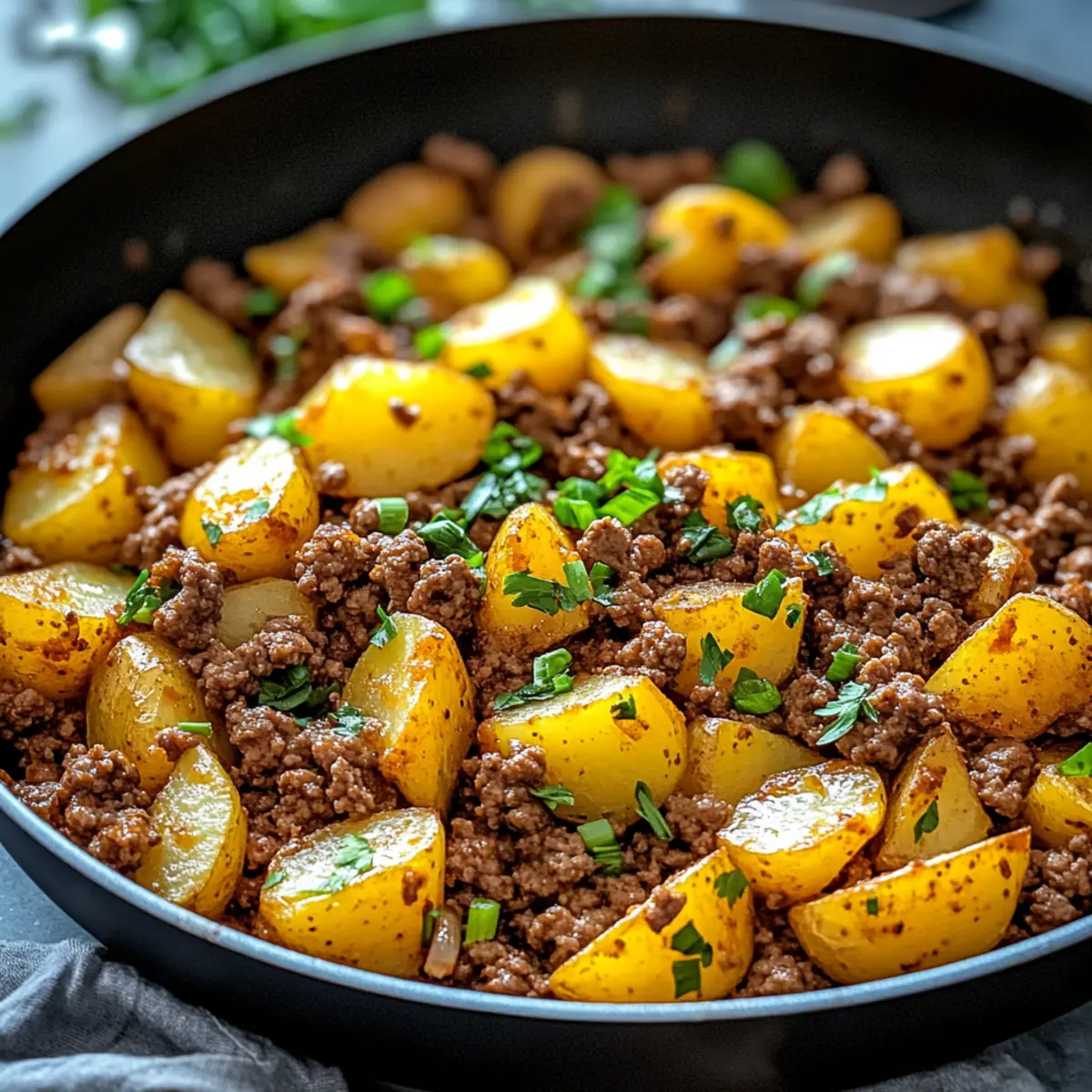 Once everything is heated through, remove the skillet from heat and sprinkle with chopped green onions for a fresh touch. Serve the scrumptious Ground Beef and Potatoes warm, allowing guests to enjoy this comforting, home-cooked meal that brings smiles to every dinner table!