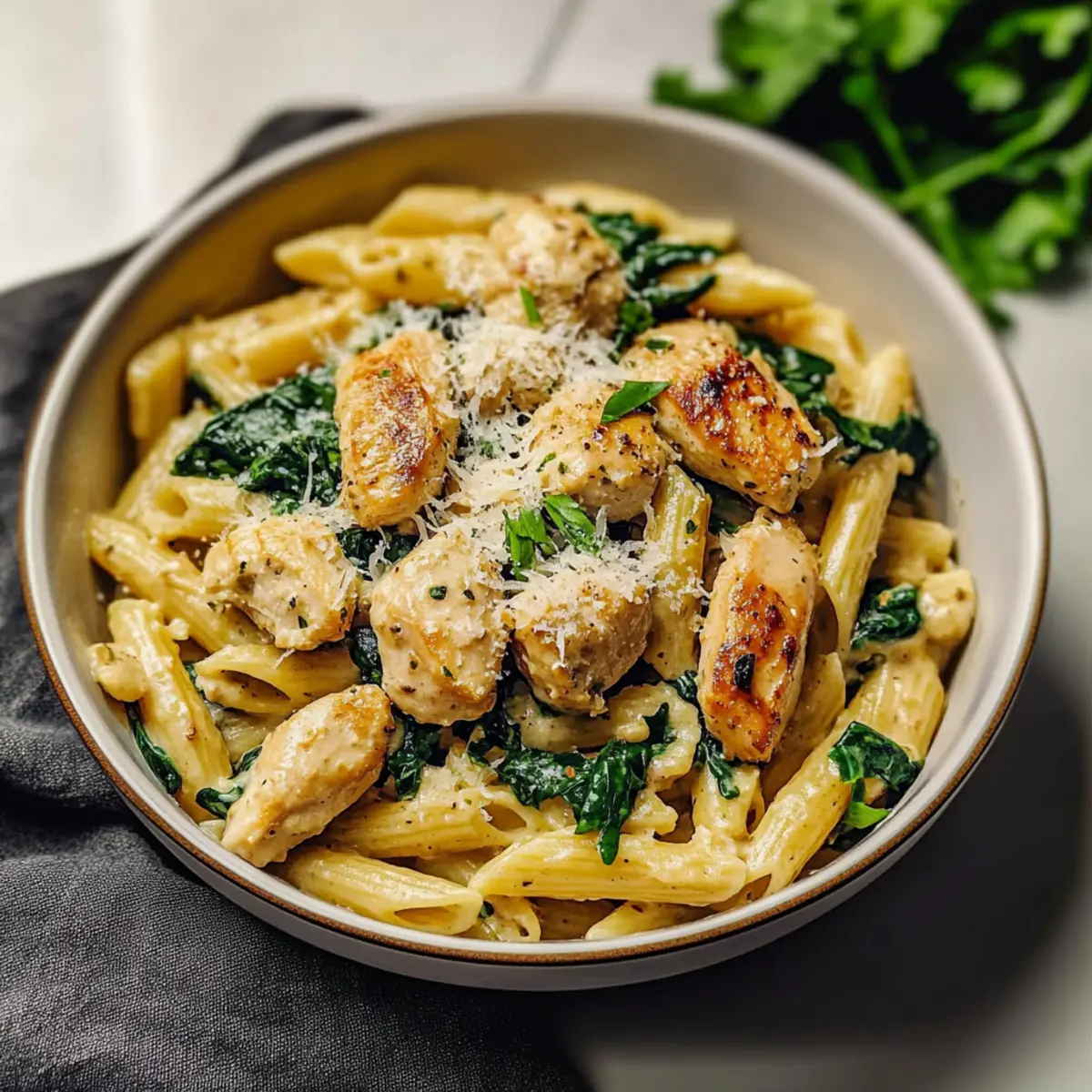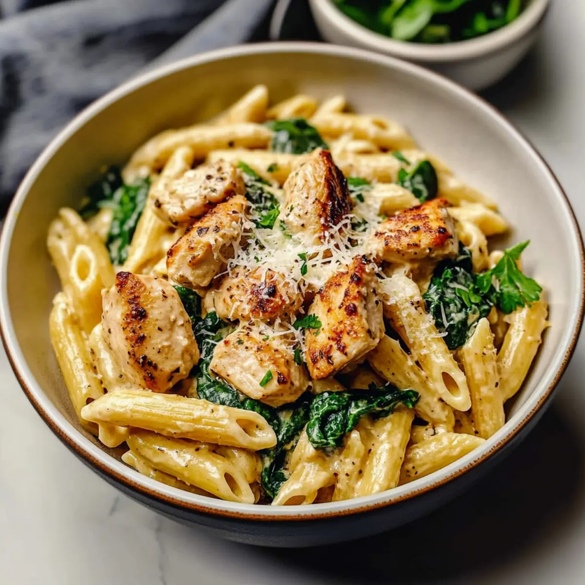 Return the cooked chicken back into the skillet, along with the drained pasta. Toss everything together in the creamy sauce, ensuring the pasta and chicken are well coated. If the sauce is too thick, gradually add in some reserved pasta water to reach your desired consistency. Stir in the baby spinach just before serving for a pop of color and nutrition.