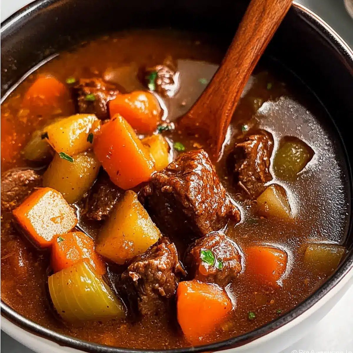 No worries! If you find the stew becoming too thick, simply add a splash of beef broth or water during the cooking process. Stir it gently to blend; this will restore the desired consistency. Remember to keep an eye on it as it simmers to prevent sticking.
