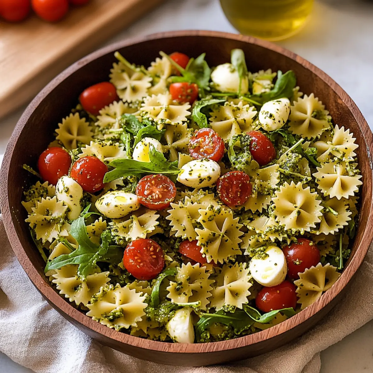 Begin by bringing a large pot of salted water to a rolling boil. Add the mini farfalle pasta and cook according to package instructions until al dente, about 10-12 minutes. Once cooked, reserve 1/3 cup of pasta water, then drain the pasta and set it aside to cool. This helps prevent the ingredients from wilting later in your vibrant Pesto Pasta Salad.