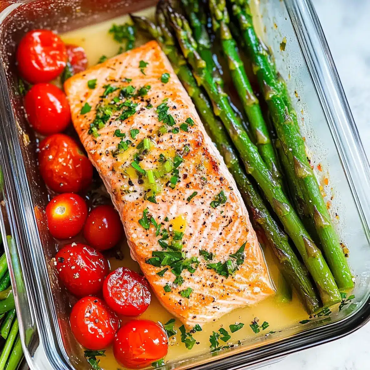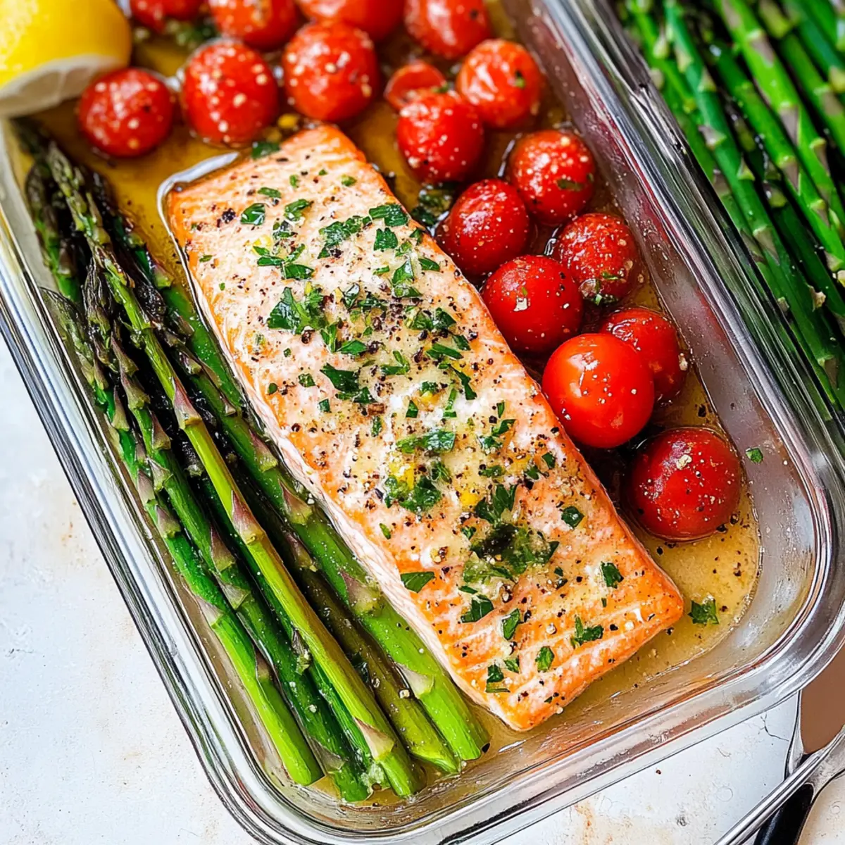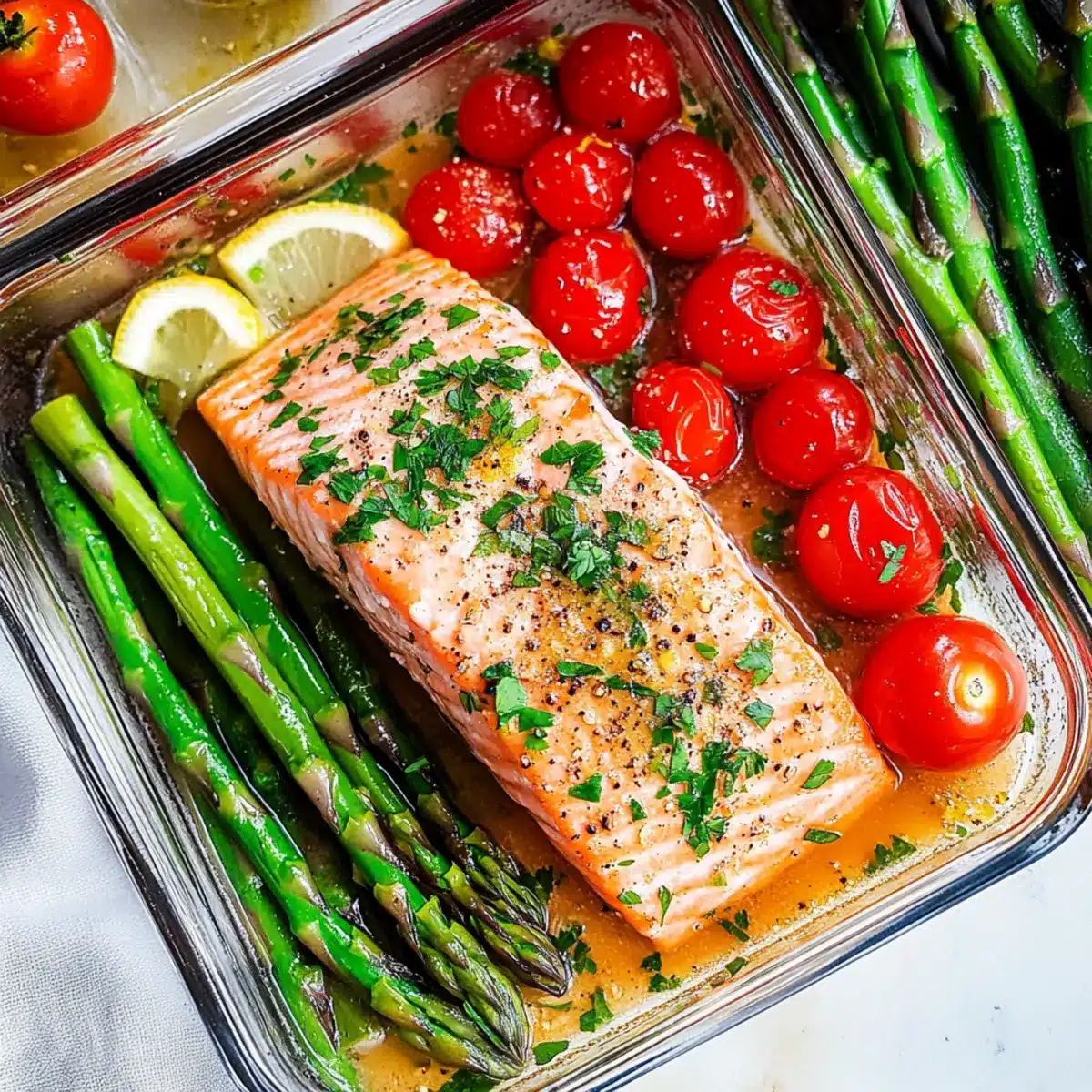 Spoon the salmon and asparagus onto plates or into meal prep containers, ensuring to drizzle the zesty lemon sauce over the top. Finish by topping the dish with the prepared tomato mixture for added freshness. Your Salmon with Asparagus and Lemon Sauce is ready to be enjoyed, perfect for a quick weeknight dinner or meal prep!