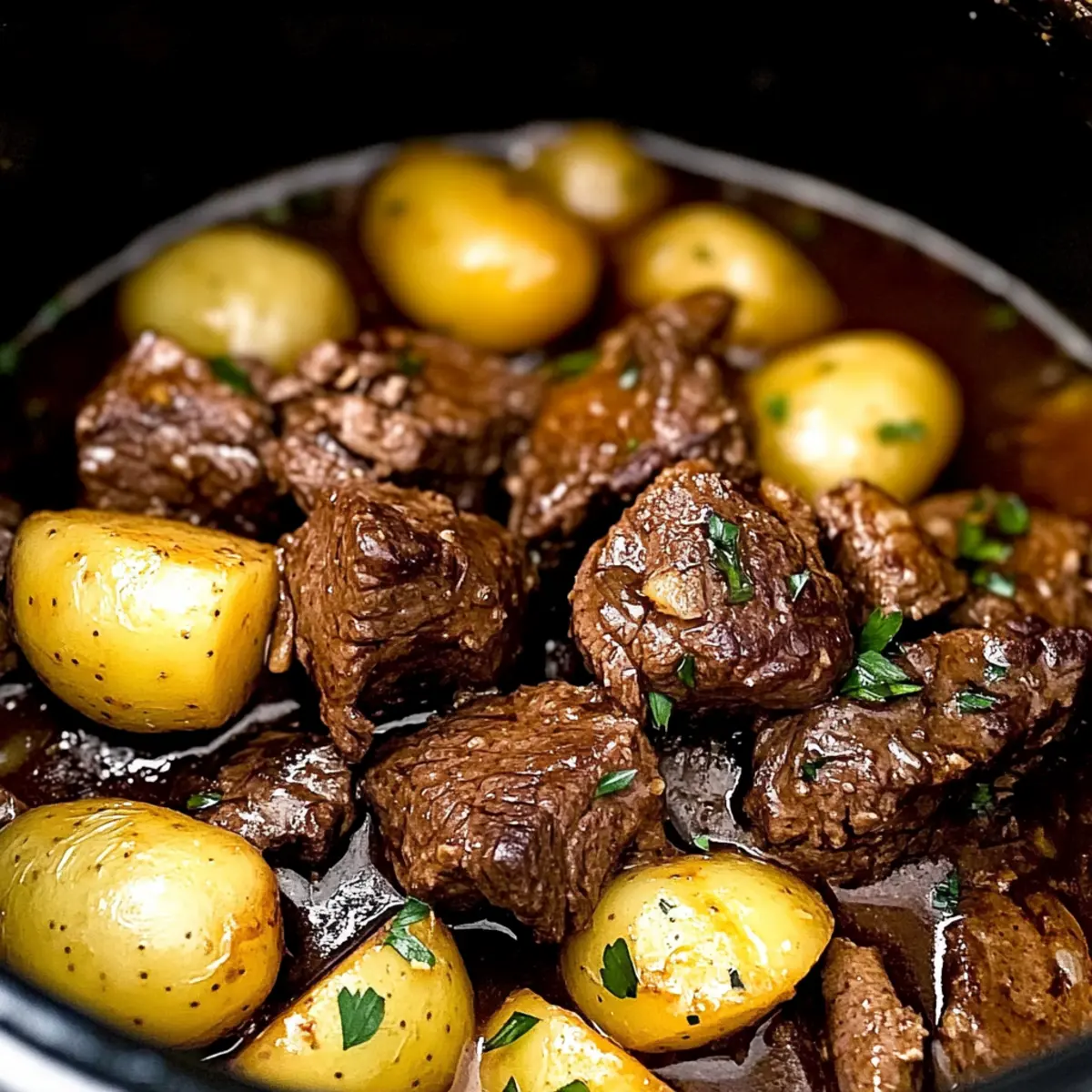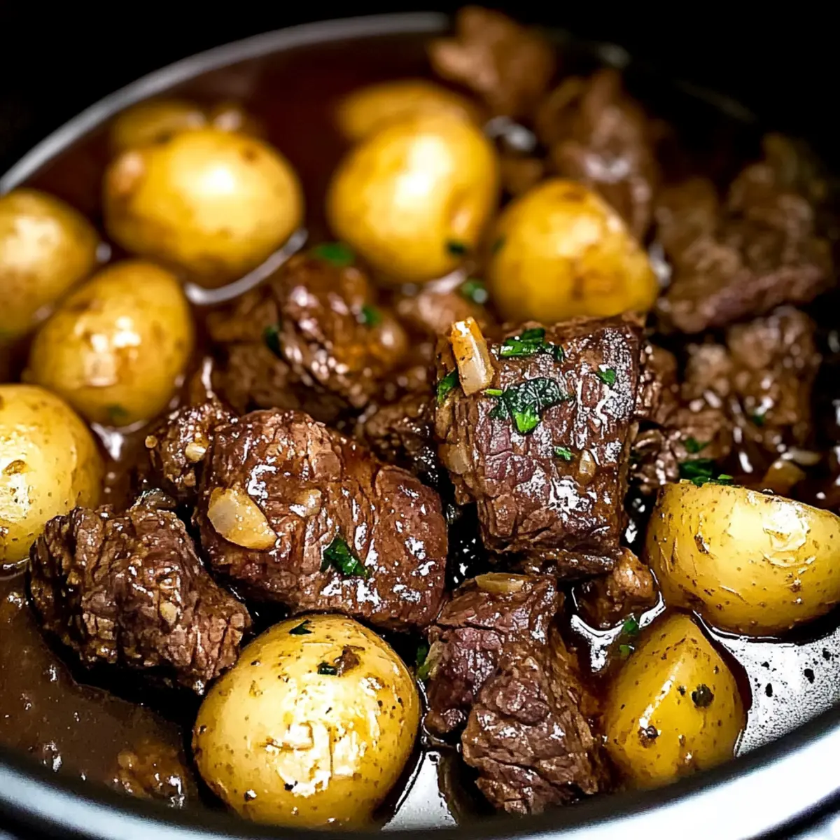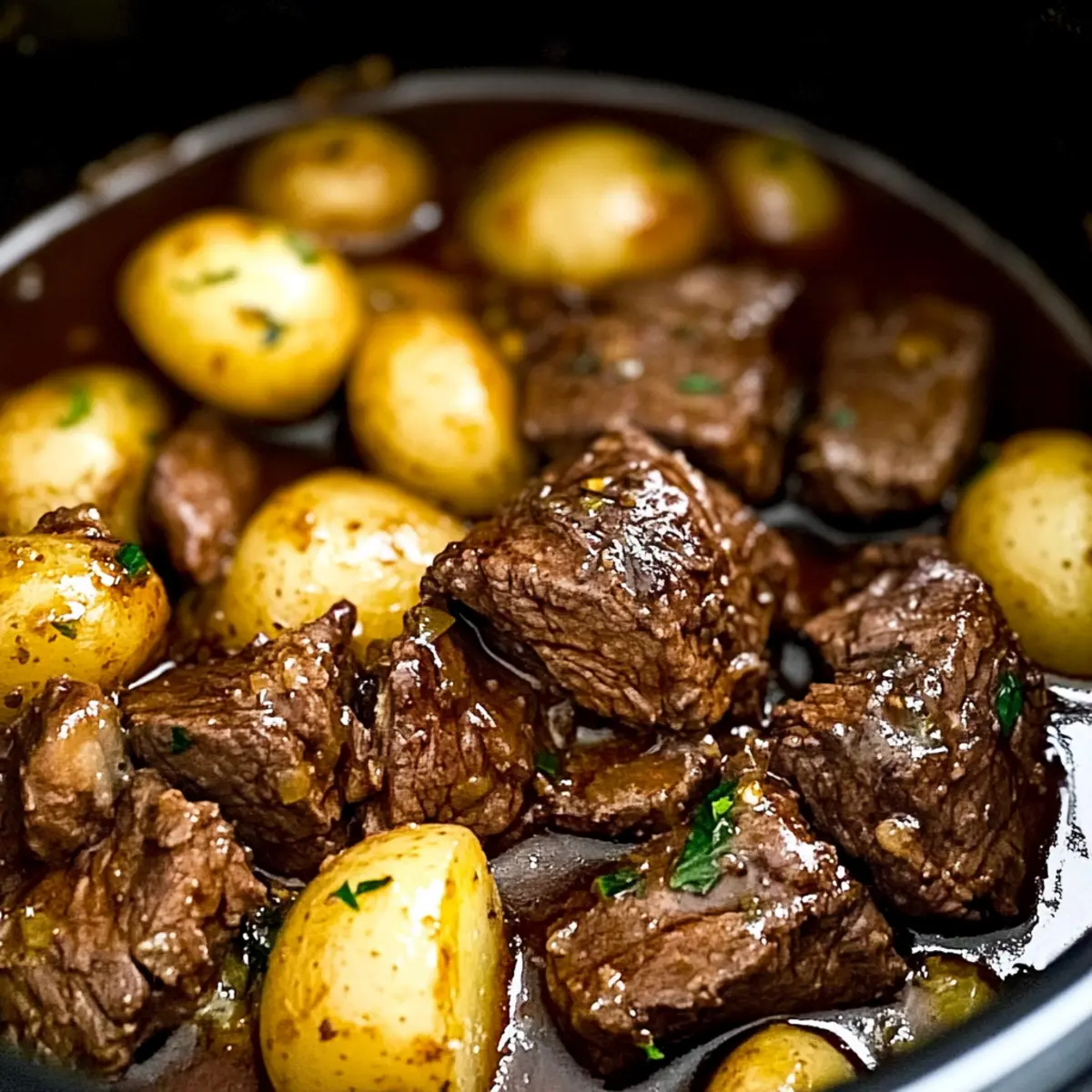 - Once cooking time is complete, carefully lift the lid and let the steam escape. Dish out generous portions of beef and potatoes, drizzling the garlic butter sauce over each serving.