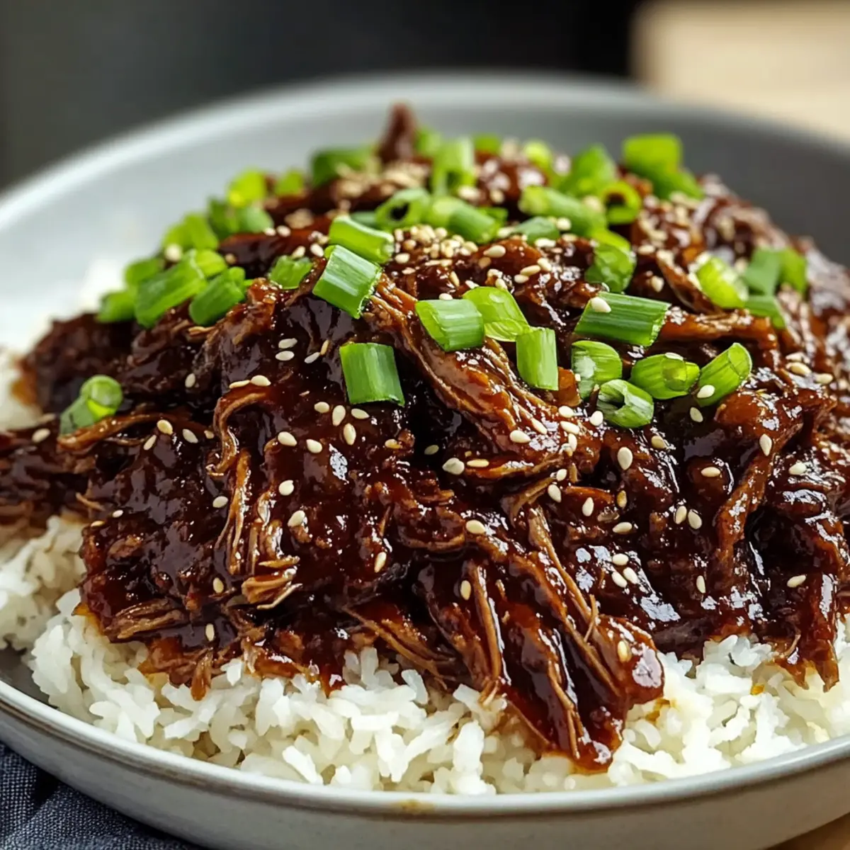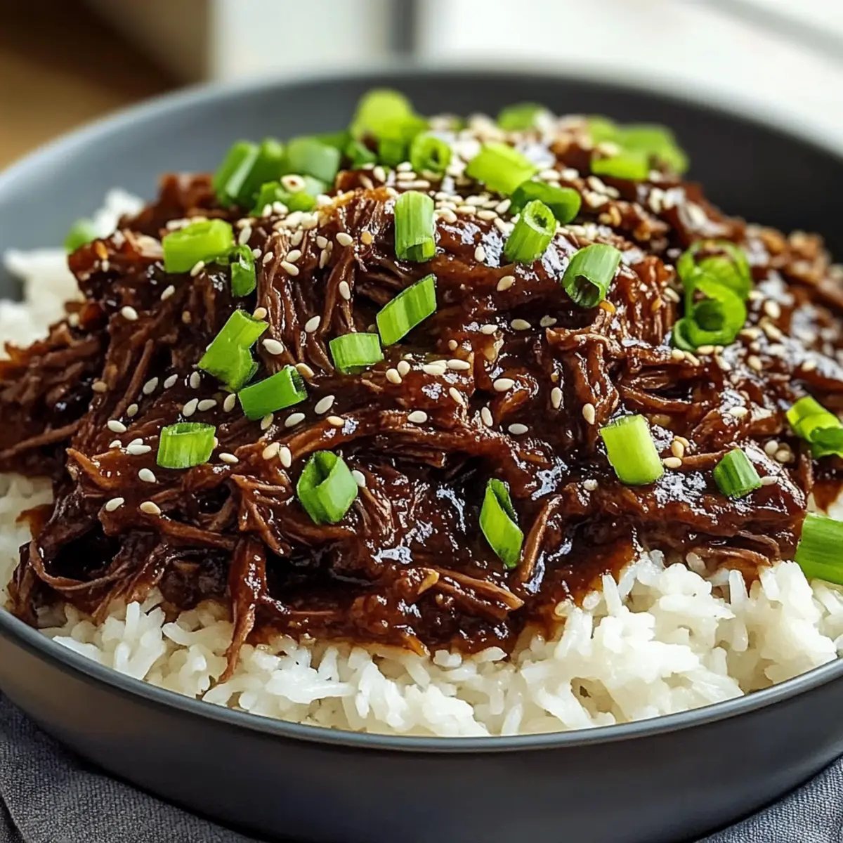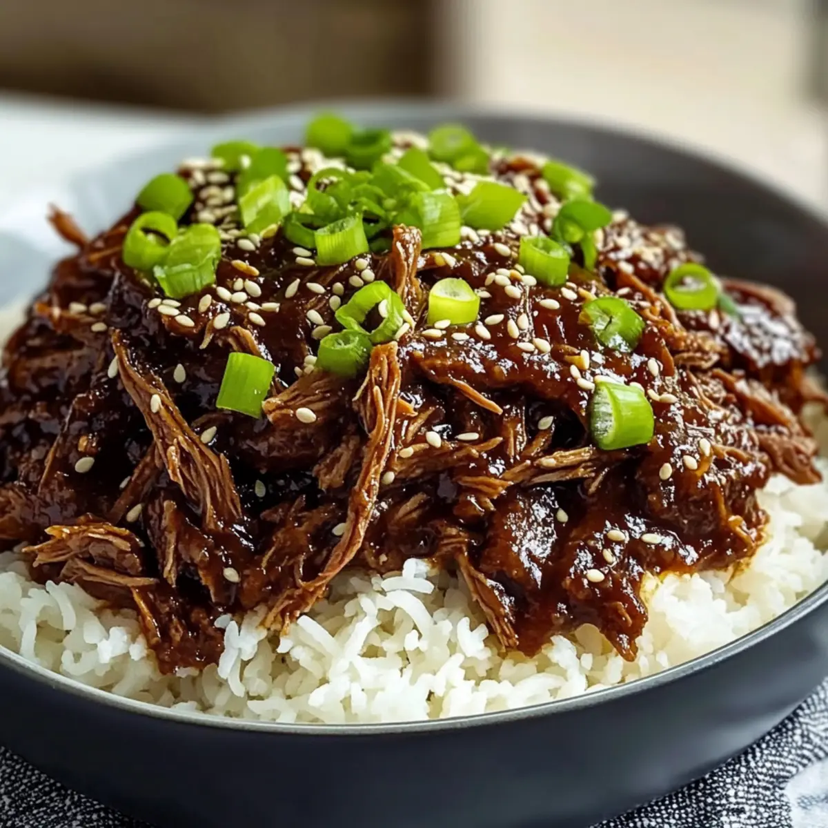 - Return shredded beef to the thickened sauce, garnish with green onions and sesame seeds, and serve over rice or in lettuce wraps.