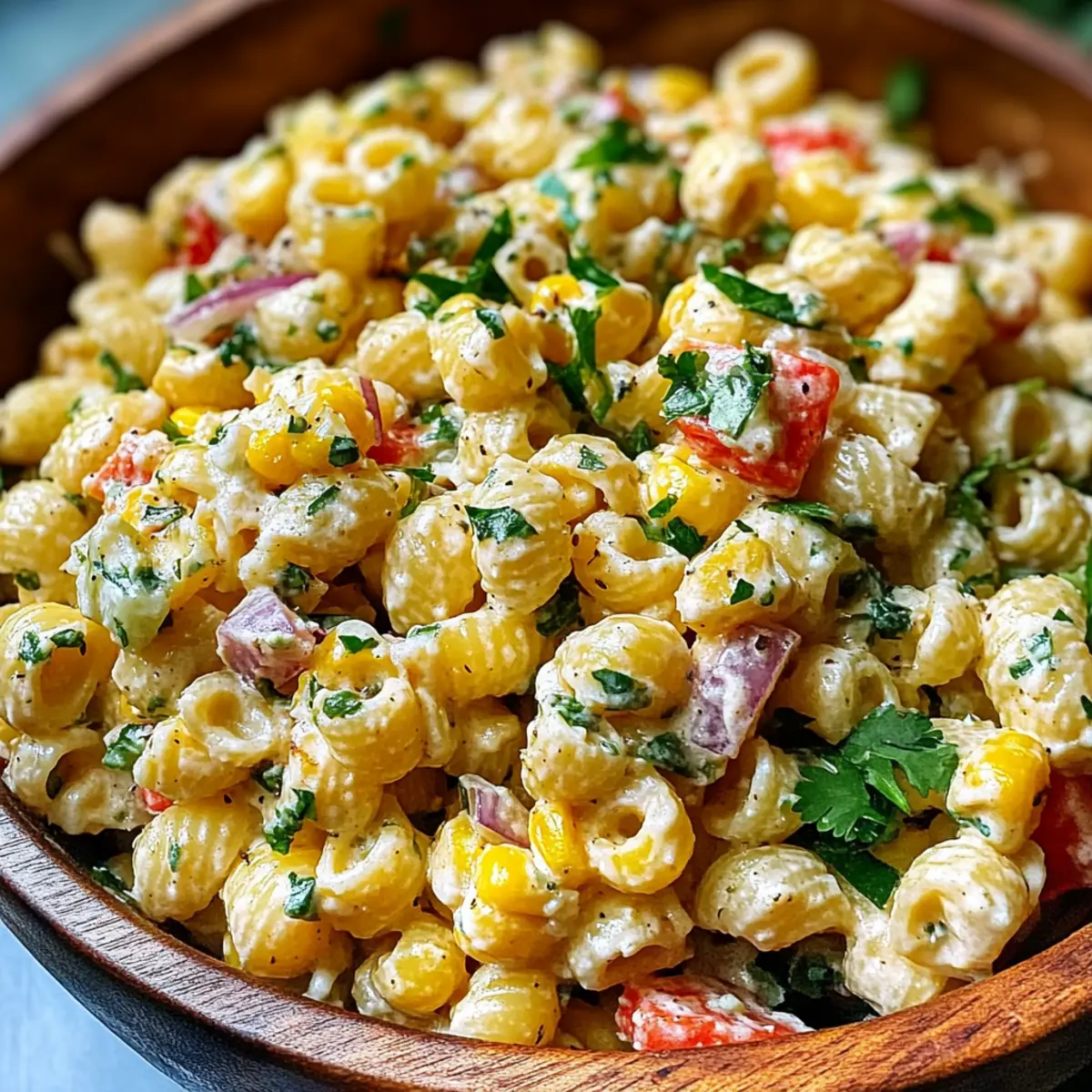 - In a large bowl, combine cooled pasta, street corn, red bell pepper, red onion, and cilantro. Toss gently.