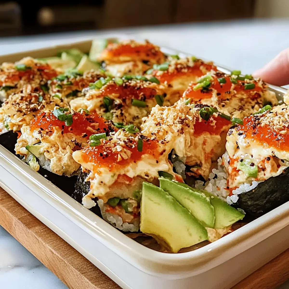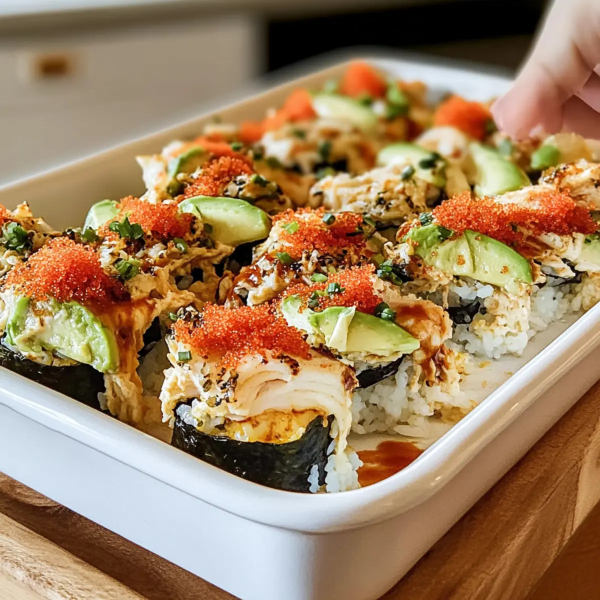 Once out of the oven, allow the Sushi Bake to cool for about 5 minutes before slicing it into squares. Garnish with sliced avocado, nori strips, and any optional toppings like green onions or tobiko for extra flair. This warm, shareable dish is perfect for gatherings and will impress everyone around the table.