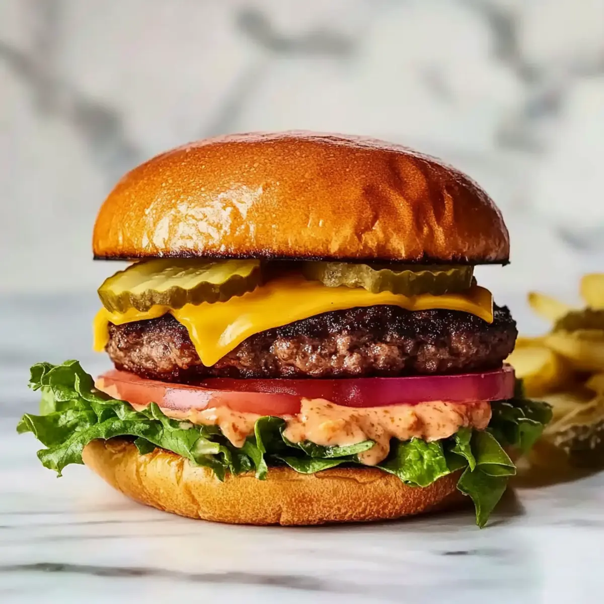 While the patties are cooking, prepare the epic burger sauce. In a separate bowl, whisk together ½ cup mayonnaise, ¼ cup ketchup, 3 tablespoons of dill pickle relish, and 1 tablespoon of Dijon mustard. Mix until smooth and fully combined—this creamy sauce will elevate your cheeseburger with a delightful tangy flavor.